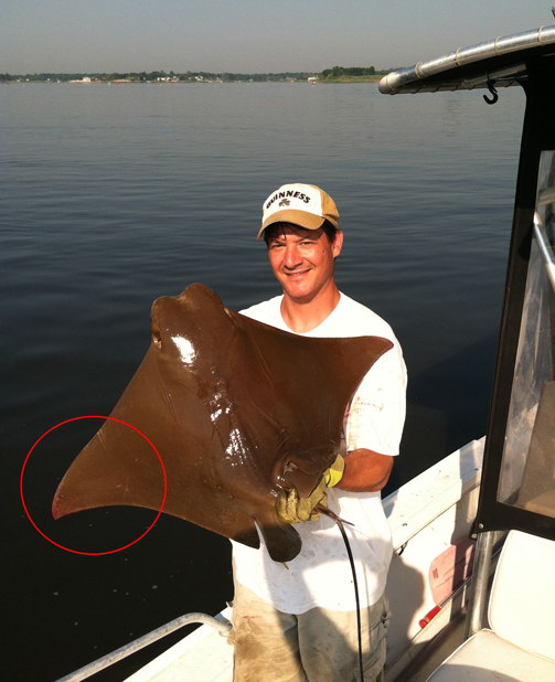 Cownose rays do have a stinger in their tail but it's not deadly like that of the stingray that killed the Crocodile Hunter (who was very foolishly closing on it from above and behind). Stingrays hunt by listening for the heartbeat of their prey, which is why he got hit right in the heart. Cownose rays are proliferating like mad because sharks are their main predator and the shark population is in trouble (we ain't talking about dogfish). Cownose rays can wipe out large concentrations of oysters and other shellfish. Their wings are definitely edible. Whether you like them depends on your taste. |