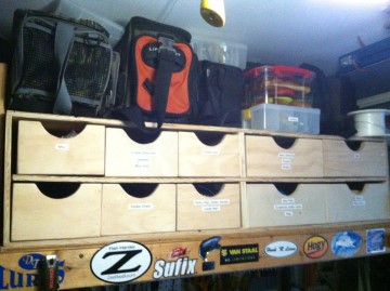 I built drawers in my garage for organizing a lot of the small stuff... Then I have separate bags ready to go for Freshwater Fishing, Fluke Fishing, Jetty/Surf Fishing and Bridge Fishing. I have the sealed container with all my Gulps in it for easy access. I also have 5 gallon buckets with lids/seats for early season Clamming for Bass, and one for Trout Fishing