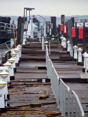 Winds over 60 MPH took out a good portion of the commuter pier as well as Dock boxes and planking on all piers.
