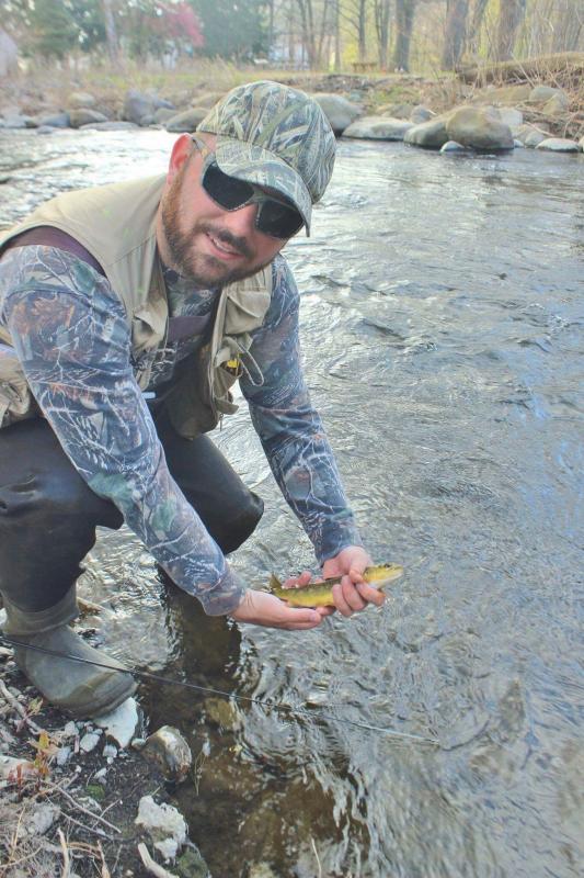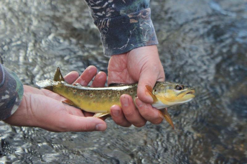 Got out wends. with a work buddy who moonlights as a wildlife photographer. Waded upstream(usual spots) about 2 miles. River was super active- tons of small minnows/fish- trout were feasting on them. Ended up landing 15 rainbows(prob 5 with some size- topping out around 15, and then rest cookie cutters) 3 browns (1 pictured, one maybe 5in but angry, and a 12 who slipped up before he deholstered his dslr. Also sat on a rock and watched some bows crush top water nymphs and other bugs under a tree. Bruce had some issues with depth but hit one solid one(his first on the Fly) and had a blast watching the bows check out his flys. Water was still super cold and clear. This was before the big front on Friday.