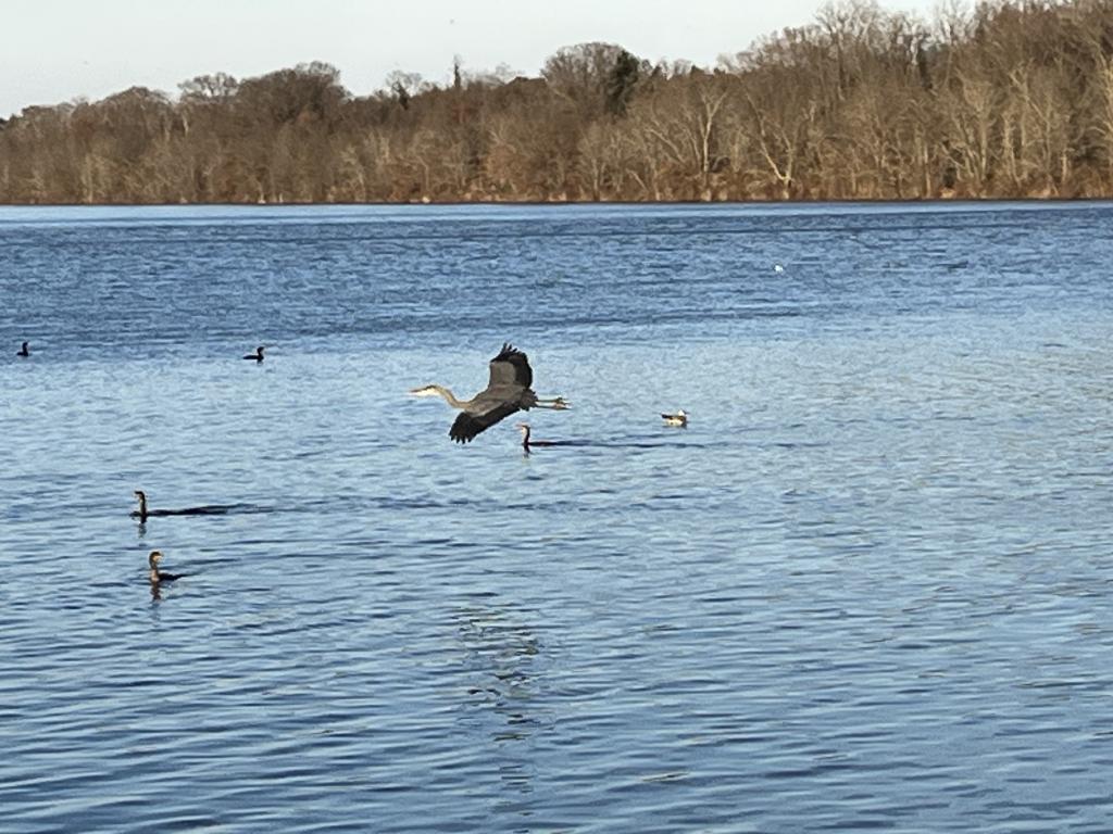 Went fishing 🎣 in 40 degrees Carnegie Lake this evening on a cool, sunny day with a strong west wind. Caught nothing with worms 🪱. Caught and released a gizzard shad while ultralight jigging. When I threw it back into the lake, a gull caught, then swallowed it. One of the eight other fishermen snagged shad. Looks like the lake is fished out. Took photos. Cormorants caught then swallowed shad. A great blue heron tried to steal shad from the cormorants but was unsuccessful. A bald eagle 🦅, Canada geese and mallards flew nearby.