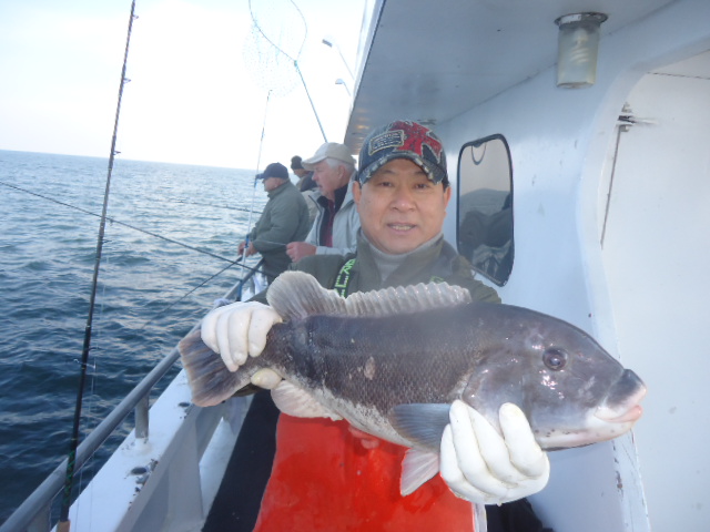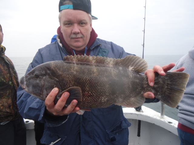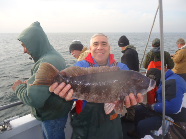12-4-13 Another really pretty day,,flat calm,warm.Water temp back up to 48 degrees due to the warm air we have had past few days..We had an allstar cast show up due to the nice conditions..Fishing was decent overall..sectional,,,but decent for most...One drop the bow was into the bite and you would watch some real nice fish come to the net,,,another drop and the stern had all the action..No real reason for any of it but thats the way it works sometimes..The good part was most everyone got in the game and caught fish at some point.,,,it was just really hot or cold today depending on your location on the boat..The current swung Ne instead of north and today all the fish were quality for the most part.A good number of fish were in the 3-6lb.range and pool maybe 8lbs.,,and the high hooks had 4-5 keepers,,,some had 2-3,,and only a few got the skunk.Even some of the first timers who never blackfished got into a bite at the end of the day and managed to a get a few to keep..Green crab worked but I think the white crabs overall did do best..Check out some pics...see ya tomorrow..It looks good.