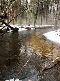 I had to go up to my Mother’s house in Newport RI this past weekend and I decided to take the scenic route up on Friday using the back roads in CT and RI. It was warm, temps in the mid-60s, and raining off and on throughout the day. My first stop was the Flat River in the Arcadia Wildlife Mngmt Area near Exeter RI. Just to get to the Flat River required driving 5 miles on an unpaved and unplowed road. When I got there I was rewarded with a fast moving brook that was completely free of ice. The Flat River is stocked with rainbows which can holdover and also has a healthy population of native brook trout. I didn’t have any luck at the Flat River, possibly because it was running so high and fast, so I moved down to the Wood River which the Flat River joins about a mile below where I was fishing. The Wood River was larger and also running very high. I fished a variety of lures (no bait allowed) but did not have any luck there either. Although I wasn’t able to catch anything in either river, they were well worth the drive and I highly recommend checking out either if you happen to be passing through.