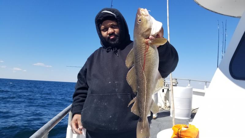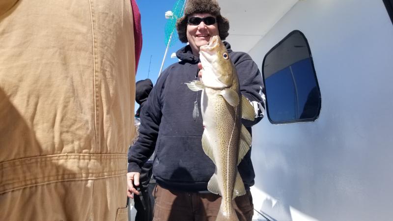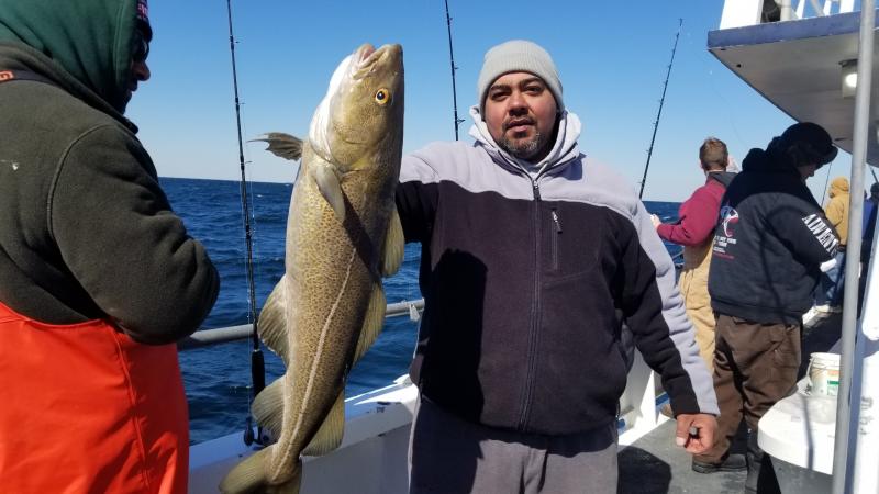 3-24-18 Very nice day offshore today,,,had good bottom life with a reading of 40 degrees on the surface...The perch were chewing for sure...hitting your bait as soon as you were on bottom...Picked at some nice Codfish today,,not alot but maybe a half dozen keepers...some shorts to ....Few pollock,,,and a ling...Some dogfish but not to bad today....Few of the Codfish were nice,,, 12- 15lbs maybe...Nice day to be out for sure either way...Unfortunately we have to cancel tomorrow..Gusty northeast winds will make the ocean pretty nasty so stay home tomorrow..Let you know the next nice day to go here...see ya then..