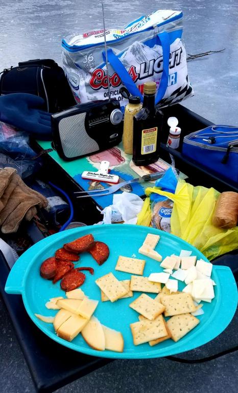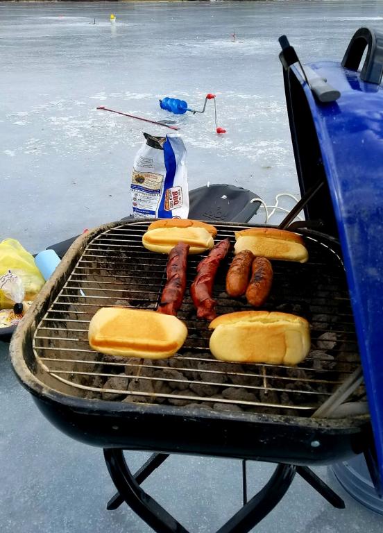....and the hard sweet water did not disappoint Saturday and Sunday.... neither did the brats ...beers and German pear schnapps.... Solid 7 inches of ice and bites all day long....