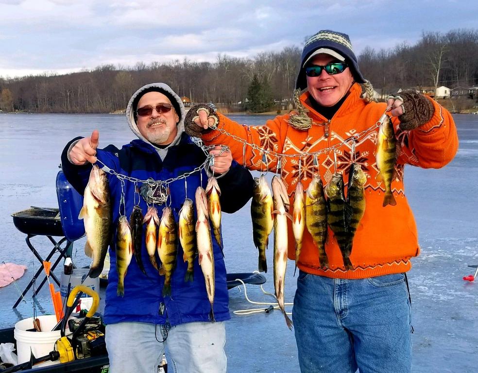 that is a swartswood stompin right there... those perch are nice and that bass is nice as well. you guys know how to have a good time on the ice love the grill shots. great report