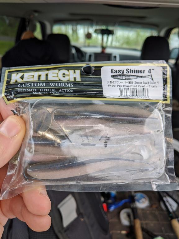 Fwiw, the Keitech I had the most luck with were the two shown below, 4" Easy Shiner Pro Blue / Red Pearl and even more the 4" Easy Shiner Sight Flash. To get more mileage from each, after a few fish or a pickerel ripped one up, I'd cut off an inch or so from the head and they worked just as well and when that got ripped up I turned the plastic upside down (belly up) to thread the ball jig and each worked equally well. Just a way of getting a lot more mileage out of each plastic. As long as the tail gives off that vibrating paddle movement and the plastic sits straight on the hook shank and swims straight, it works. Don't bunch up the plastic head on the hook shank, seems to impact effectiveness of the presentation.
