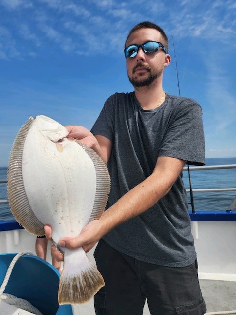 We are out on this beautiful end of July summer day with a nice, cool ocean breeze and a nice crowd of customers. Our last three trips we've been fishing a different location, south in the ocean. Today, we don't have any limits aboard yet but we have 10 or 11 anglers that have their two keeper fluke and we have multiple limits on big sea bass. Pretty decent day of fishing. We will not be lighting up tomorrow, Thursday. Our next trip will be Friday, July 29th. We look forward to seeing you at the dock. The fare is $90 and we have a daily $5 pool for the biggest fluke at the end of the day.