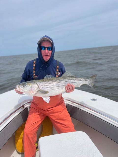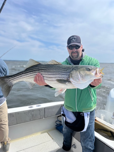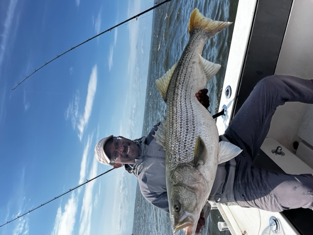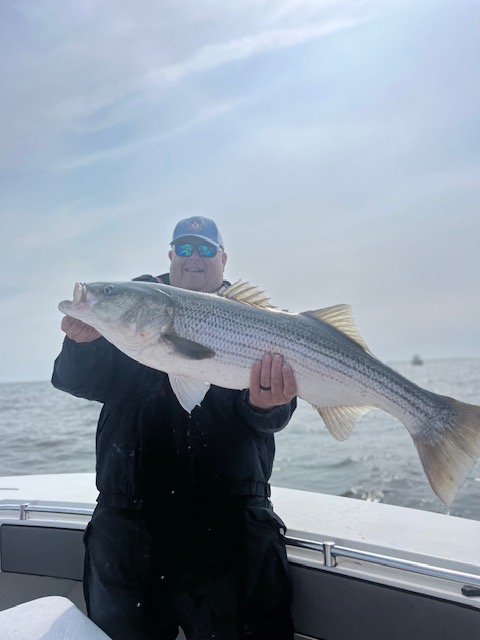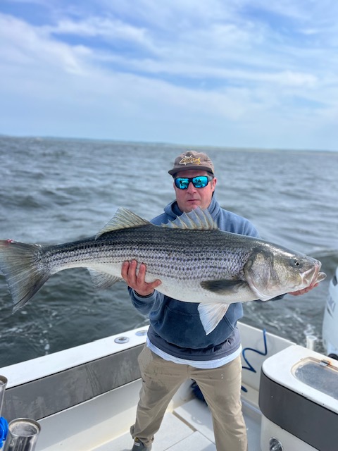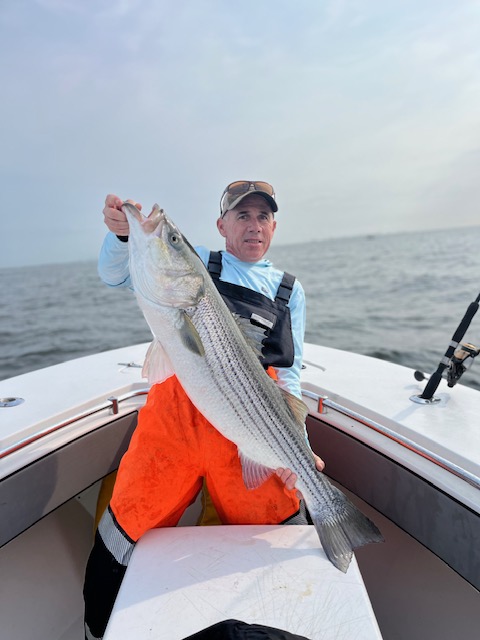 Great striper fishing continues. This morning Dave and crew had a great bite all morning landing a few dozen fish to around 30# taking a few for the table and releasing the rest. This afternoon Mike and crew were onboard. Took a bit to get the bait but once we loaded the wells it was game on. Non-stop action all afternoon for guys with fish 38#. Took a few for dinner and released several dozen more for another day.