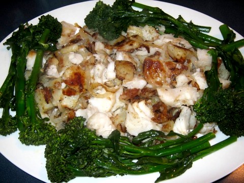 We had my sister over the other night for dinner and it was great. I always thought the fresh cod tasted like lobster with the melted butter on it. Ingredients 3 lbs cod fillets 6 med red potatoes 2 med yellow onion Non-stick spray Salt Pepper 1/2 stick Melted butter Directions Boil or microwave potatoes until done, let cool, peel and slice peel onion, cut in haves and slice In a 5 quart sauce pan boil water and add 1/2 tsp of salt Heat lg 12in skillet and coat with non-stick spray(med heat) Place potatoes in pan and cook till golden brown Add onions when potatoes are 3/4 way done Cook till onions are soft and slightly brown Place fish in boiling salted water and cook till fish flakes, 10 minutes or so Drain fish in strainer and place on top of potato and onions Drizzle fish with melted butter, salt and pepper and serve. Enjoy!! Leif