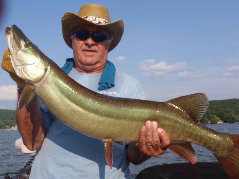 Had a couple of really nice guys on my boat today....decided to fish Echo in the morning....nothing going on....took boat out and headed to Greenwood for afternoon....6 lb. + walleye, and a nice smallie. Very hot....guys wanted to go in at 6 pm. On the way in one thinks he is snagged on the bottom while reeling in....but NO!!! the mighty musky makes its appearance!!! Quick pic and quick release!!!!! Literally...on the way in....what a pleasant suprise.....Enjoy....Capt. Dave