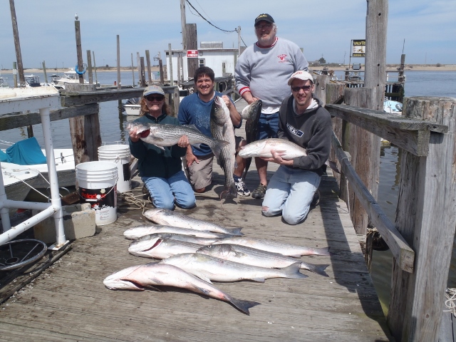 Today we had on board the DeBiec Family Mom and Dad Sandy & David and sons Dan and Russel. Great weather and conditions greeted us. Made it out to the grounds and it was not long before the poles were bending. Had some good action with bass and the first Yellow Eye Demons of the year. After the change the bite dropped off and we made a litttle move. This was the right choice, took a little bit but then the bite started again with double headers. The biggest fish of the Day 30 lbs was boated by Russel. Boat was limited out, plus bonus fish.A great day on the water with a great family, does not get any better!