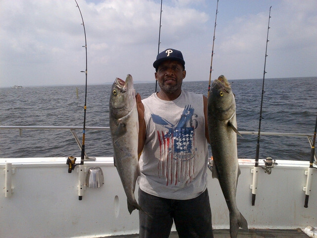 We had a few shots at the fish on jigs early in the day and then I decided to put the anchor down and throw some chum. In a few minutes we were holding 5 to 10 MONSTER Blues on at a time. Bait or jigs as fast as you get your line in the water you had a MONSTER Blue. It was like fishing in JURASSIC PARK. Night fishing has also been very good. See pic's below The GOLDEN EAGLE sails daily for Blues & Stripers at 7:30am and every night for Blues at 7:30pm from Belmar Marina in Belmar, NJ. For more information visit us at www.goldeneaglefishing.com or call 732-681-6144. See you on board |