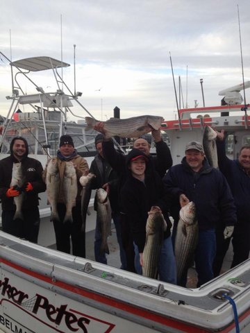 Today we had bob n friends out for some striped bass fishing. We headed up to the same area as yesterday morning to some great conditions. It seemed we were going to get better fish,since we started w a triple header with 2 being keepers . Trolled for hours w non stop action of shorts n a few keepers. Made a move closer to home and we had a nice pick of all keepers. Adding another double header keeper. All in all it was a great day on the ocean . Thanks again guys . See u soon