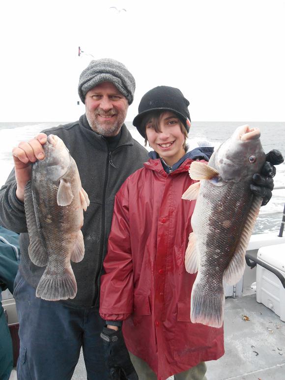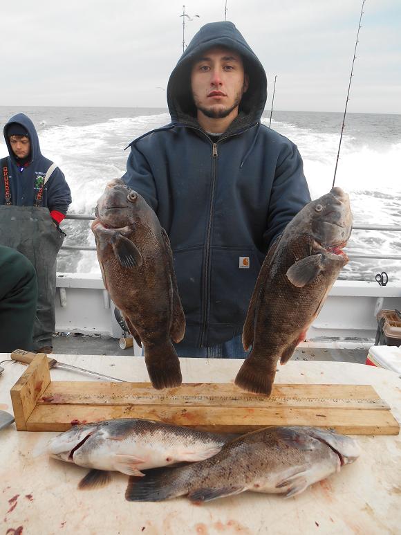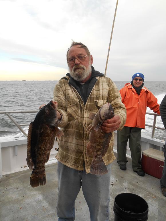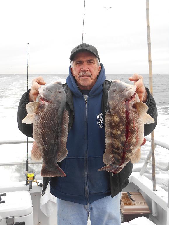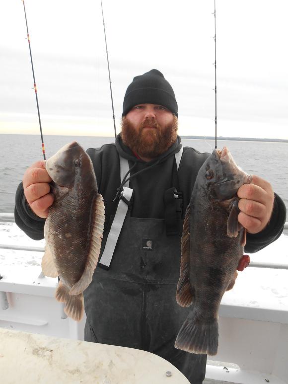 Hey gang, Capt. Scott here. I fished three wrecks today from 55 to 70. Started out pretty good, although it ended up to be just a fair day. Manny was high hook with four nice tog. Others had 2 and 3. Fished hard, thought they'd bite a little harder today with the big blow coming tomorrow. Docked around 3:30ish. Good guys on the boat. It certainly was a lot nicer than I thought it was going to be today in the ocean. Forecast is for gale force winds Sun. into Sun. night, but Monday is going to be nice so we'll be lighting up at 5:30 A.M. Here's a few pictures from today. P.S. green crabs, white leggers, heated handrails. All day blackfish 7:30 - 3:30. Thx., Capt. Scott