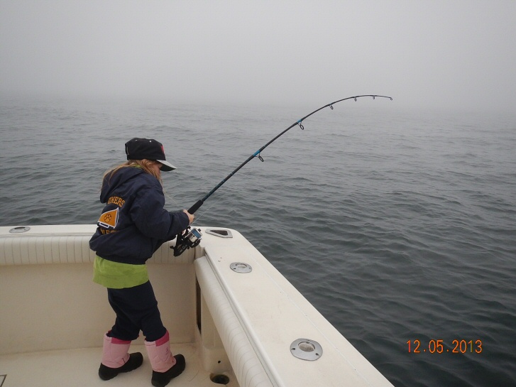 Don Beshada was on board today with his daughter Emily. Emily wanted to sharpen her Striper catching skills and practice a little C & R. The ocean was calm with a zero visibility Fog which made for cool damp fishing conditions. Paul got on some solid Bass reads but the Bass were a little more difficult to catch then yesterday. At 11 AM we called it a day but in spite of the slow bite Don and Emily landed over 25 Bass all of which were released unharmed. It's always a fun time when Don a Emily are on board. Don will be back to do some Blackfishing. We will not see Emily until the Spring Bass run.