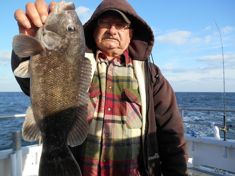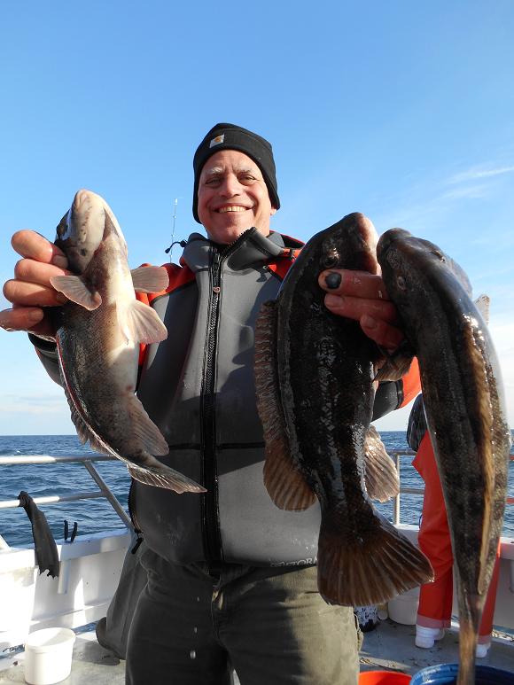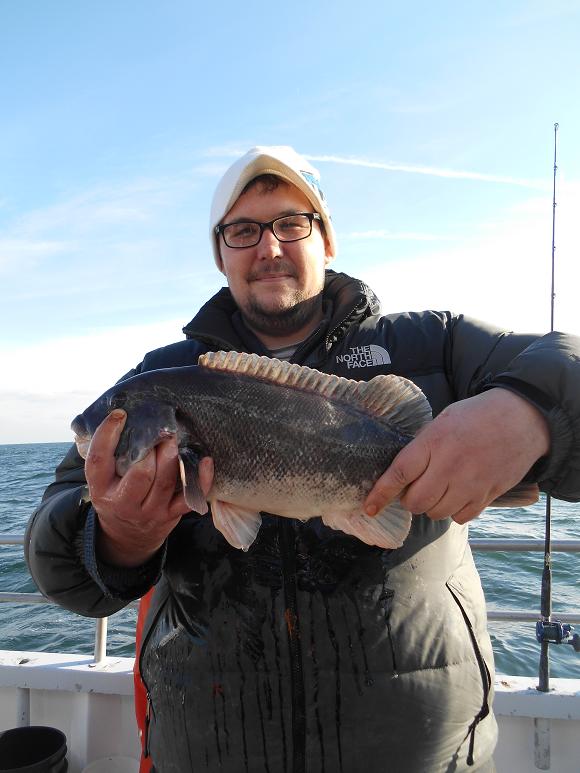 Hey gang, Capt. Scott here. I've been in high octane mode of late, having the Prowler flying around out here. We're fishing a little further of where I've been fishing, it's steadier action. We already have guys with 3-4 keepers with great blackfish action. It's windy and cold but the fish are chewing. If you want to get out blackfishing, come out tomorrow, Sun., Dec. 8th because the weather is going be evil Mon. I'll give a followup report later with pictures and pool winner. Pool winners have been averaging in the 6-9 lb. class of late. With the biggest being 10lbs. last week caught by Tyler. Capt. Glenn said come on down tomorrow morning. Thx., Capt. Scott Heated handrails, heated cabin, green crabs and white leggers.