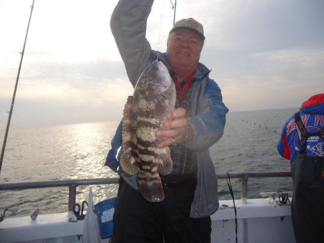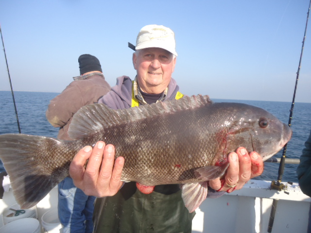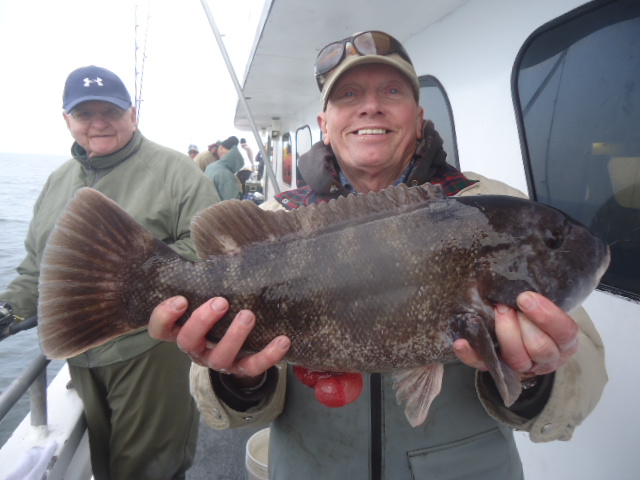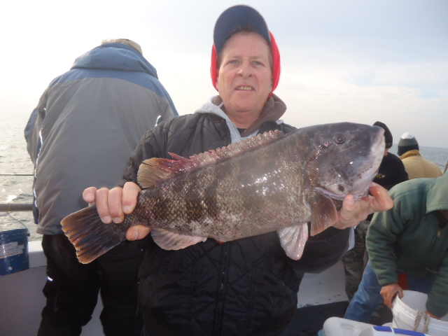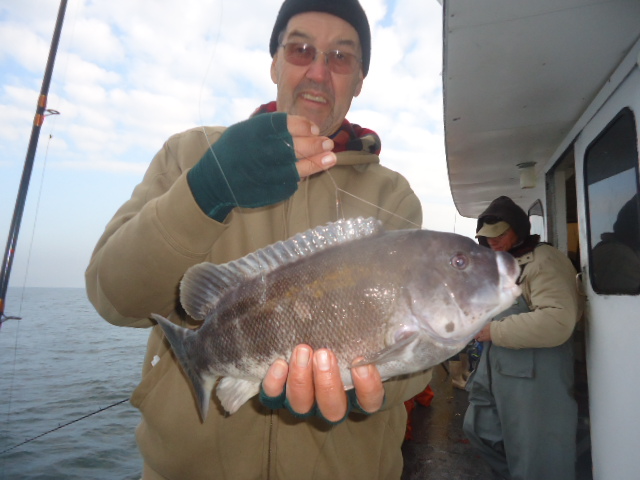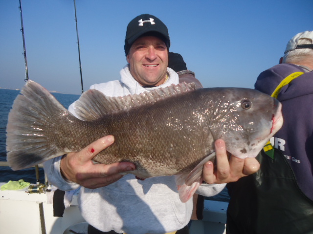 12-4-13 Another really pretty day,,flat calm,warm.Water temp back up to 48 degrees due to the warm air we have had past few days..We had an allstar cast show up due to the nice conditions..Fishing was decent overall..sectional,,,but decent for most...One drop the bow was into the bite and you would watch some real nice fish come to the net,,,another drop and the stern had all the action..No real reason for any of it but thats the way it works sometimes..The good part was most everyone got in the game and caught fish at some point.,,,it was just really hot or cold today depending on your location on the boat..The current swung Ne instead of north and today all the fish were quality for the most part.A good number of fish were in the 3-6lb.range and pool maybe 8lbs.,,and the high hooks had 4-5 keepers,,,some had 2-3,,and only a few got the skunk.Even some of the first timers who never blackfished got into a bite at the end of the day and managed to a get a few to keep..Green crab worked but I think the white crabs overall did do best..Check out some pics...see ya tomorrow..It looks good.
