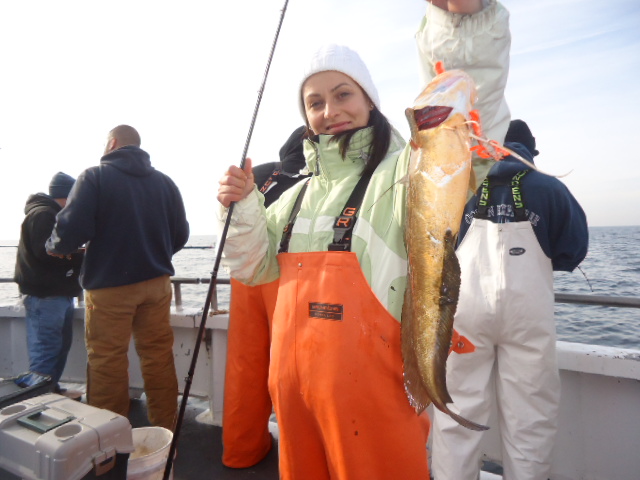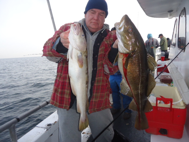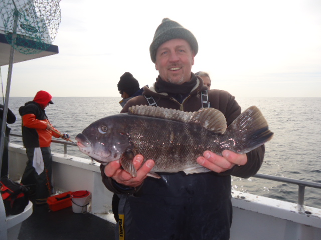 2-1-14 Really nice today,,I mean really nice....Flat calm,,,,we caught some nice fish...it seemed a little slower with bites than the previous days but still we did some moving around and some of the guys got into some Nice Codfish,,,handful of keeper Togs,,,and some lings,,,also a few nice keeper Pollocks...Not everyone had some fish to go home with,,I would have definately likedl to see some more fish go around but we took what was given to us..We had a couple of guys with two keeper Cods each,,few had one,,High hook actually had four Codfish today,,two of em keepers,,Not as many Blackfish as previous days,,they seemed a little sluggish but still a few nice fish...Lings scattered around the boat,,plenty of perch bites,,No lack of them today..Check out some pics,,,tomorrow looks nice again!!!See ya for coffee..