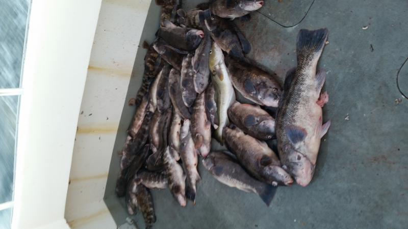 Fish Monger II Mon 12/15 Blackfish to 14.3 lbs Another over 13 lbs - Well more of the same today had to work very hard for everything that went in the box. Few fish everywhere but picky bite n tough to get em going good. checked out a couple of different places today and the bite was the same... pick a few n some shorts. Not good but we find a couple giants today and our 3rd n 4th teen fish of the season... Erocks monster female at 14.3lbs(released) also hh w 8 keepers and Robert Rusnack personal best at 13.5lbs. Congrats guys!!!! Still didn't find the bite we were looking for. Guys worked hard for 36 keepers n a cod.