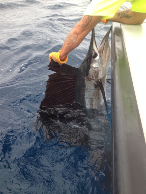 Kite fishing a live google eye, we hooked up this sail yesterday. The fish measured 85 inches, but had a short stubby bill (prior injury ?). If the bill was normal length this sail would have been 8 feet long ! Love it down here, have had several board members join me already, beats NJ winter ! Tight Lines --Rich