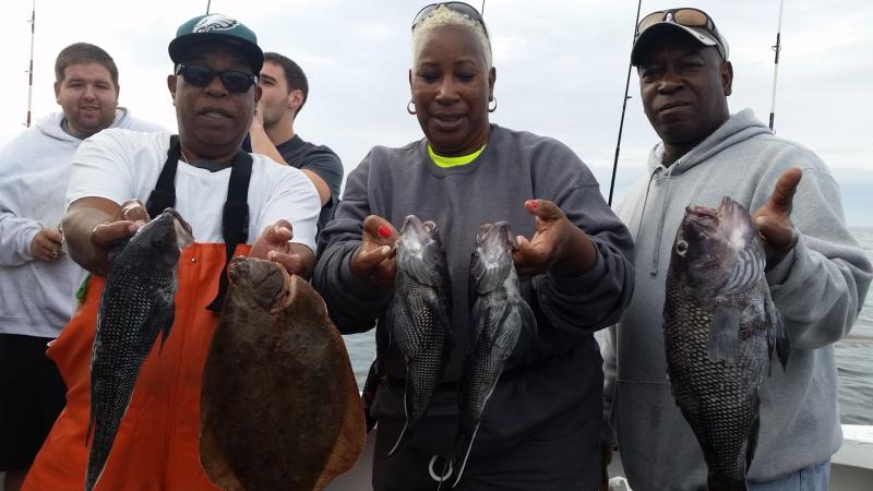 11-5-15 Even nicer than yesterday,,no wind at all.Another awesome bunch of people came out to take advantage of the weather and.We ended up with a nice catch of nice sea bass again,,along with some big winter flounder,,some up to 4lbs..really nice fish...A few nice codfish and some nice shots of ling in the mix as well...No high hooks with limits of bass but alot of people ended up with a nice batch of mixed fish...Some did not fare well for some reason but overall a good catch I thought...Exotics were not as bad as yesterday,,a few spots yes but not as bad..Tomorrow looks awesome again!!We are fishing!!See ya for coffee...pics