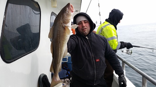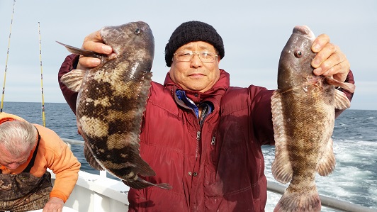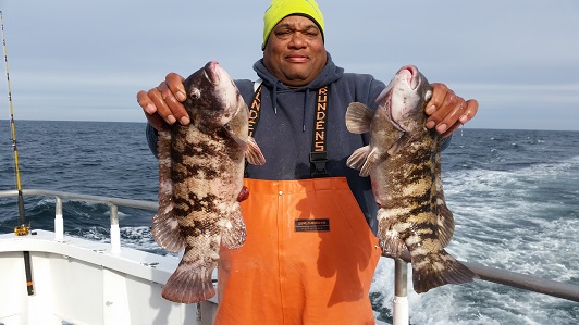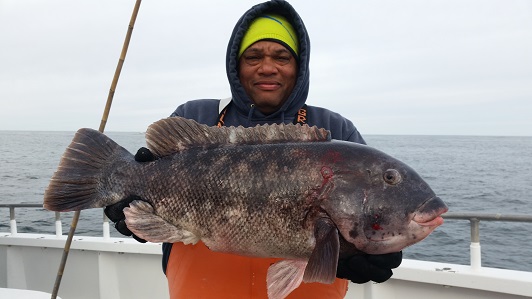 2-19-16 What a difference a day makes,,,we made our way offshore today and found nice clean and warm water..Plenty of life,,,,Skip nailed his limit of nice blackfish including a real jumbo that is close to 12 lbs.I would guess....Few others had 2 or 3 keepers and we also had some Codfish start showing up in the mix as well! We have both clams and crabs for bait,,,The shrimp or clam combo was working good today,,The weekend looks great,,fishing everyday!! Skips fish weighed in at 12.9lbs......new seasonal leader and its up to 3800 bucks!!!! WE also busted off some real big pigs today as well,,,I think the next few weeks we are gonna see some real quality so the pool is up for grabs!! See ya tomorrow.