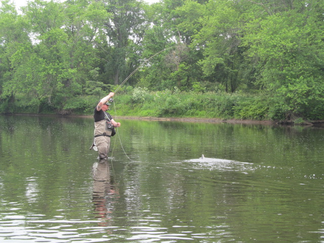 My buddy Tom hookin' up with small striped bass on the fly rod with a clouser minnow pattern. We caught and released small striped bass at multiple locations along the river today.