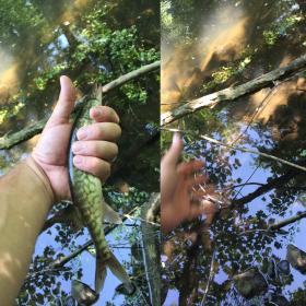 Went about 2 miles in(1/3 of lake Inez) the water is super low, and since the dam is managed to keep downstream wet, there wasn't much wAter. Super clear, but not much. One brave slime dart hit a spinner. A good hike, one fish not a bad day.