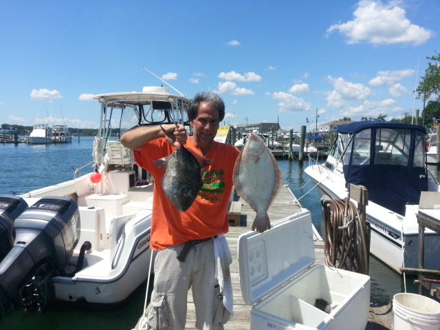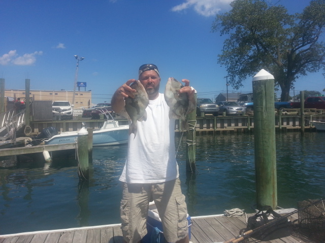 We had a good day of non-stop porgy action. We threw back a ton of keepers looking for bigger fish and still went home with a cooler full. We had Triggers, Seabass, Fluke, and a large Smooth Puffer. The Puffer went back.....highly toxic organs. I would like to welcome a couple of new friends, Kevin from Union, NJ and John from Philly, PA