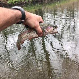 Friday I had off so I spent a few hours prowling along the Rahway River in Cranford hoping for some stockies and maybe bass. I caught a few dinks and gills on a tube and then landed a small 'bow on a craw colored squarebill crank. The fish must have already been caught and released because it was pretty battered when I landed it. A quick pic and then the 'bow swam off so a third angler (or a cormorant) can enjoy it.