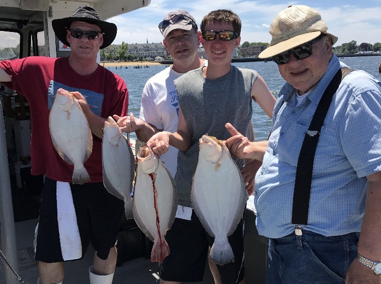 Today aboard the Down Deep Bull we ran another 6am Fluke trip for Tom his son and friends. Fluke fishing was good with nice keepers coming over the rails along with short action to keep all alert. The big Fluke are here. Come out and let us put you over your PB on our true drift Downeasters that Jumbo Fluke can't resist. Thanks guys for sailing with us again and all others who continue booking Jumbo Fluke, Jumbo Ling, Cod, winter Flounder & fall Jumbo Striped Bass, Tog & Seabass trips going forward at a rapid pace. Don't miss the next open boat trips -
