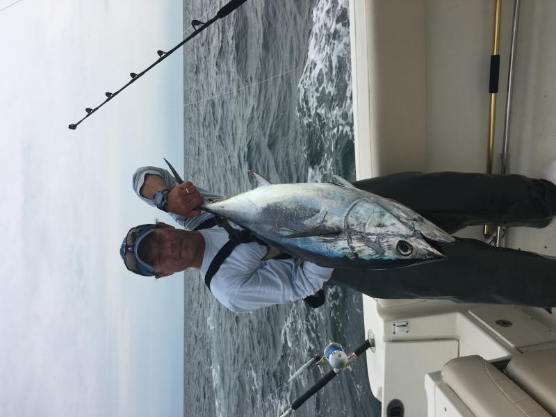 Well weather was not best of conditions running to the grounds, but worth it! Had long time friends Paulie and Al out. Found the life, had our first one bit off by a mako. Not too long after we got out under. Being patient and continued to work the area we got out over at #60. Great work landing this fish!