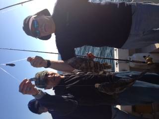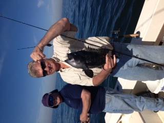 Friday morning we left the dock at 6:00 am with a group of hardcore bottom fishermen. When i say hardcore, i mean it. Unless these guys can bounce their sinkers on a rock or a wreck, they ain't goin'. I promised them we would check the bass first thing in the morning and then go bottom fishin'.They were well aware that sea bass, blackfish, and fluke were closed and they may wind up goin' home with empty coolers. That was no problem, they just wanted to bend the rod. OK, let's do it! A couple of minutes after breaking the inlet we came across a pile of bunkers, tossed jigs for a while and moved on. This scenario was repeated several times as i ran up the beach. Plenty of bait but no bass. These gents are sharp. After getting several miles up the beach, they knew we were getting into prime bottom fishing area. It didn't take long for one of them to ask when we were going to drop the hook. I knew that was going to happen, told them to cut the jigs and rig up. First drop was really good, started out with some really nice ling followed by a really nice pick of seabass and togs. Gave each one of the seabass and togs a nice kiss and released them. Tell you what, with those big lips on the togs, they make great kissers. Guys wound up with plenty of tasty ling fillets for dinner.A fun day on the water and i was pleasantly surprised at the numbers and size of the seabass. Looks like another cancel for tomorrow with four to six footers predicted. Been a tough spring but appreciate the days like today. Turned out to be a three ling circus. Take care, captain tom joseph