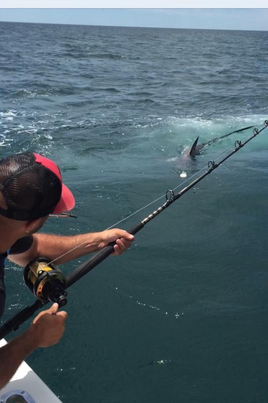 Plan was to get bait and go from there netted our bait and tried for the elusive Stripers just blues which turned out to be bait for later in the day. Hit a wreck For a couple dozen seabass and went into big game mode. Kids really wanted to see a shark, first drift Joe Sr. landed a nice 6 foot blue shark, kids were in awe. Now Joe Sr. wanted to tangle with something real big, set em back out and we hooked a 200lb Thresher, Joe and Jared took turns on him till we got the release, the look on the kids face after seeing the shark priceless!