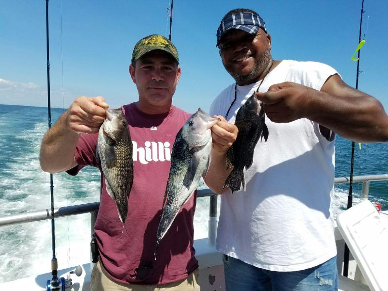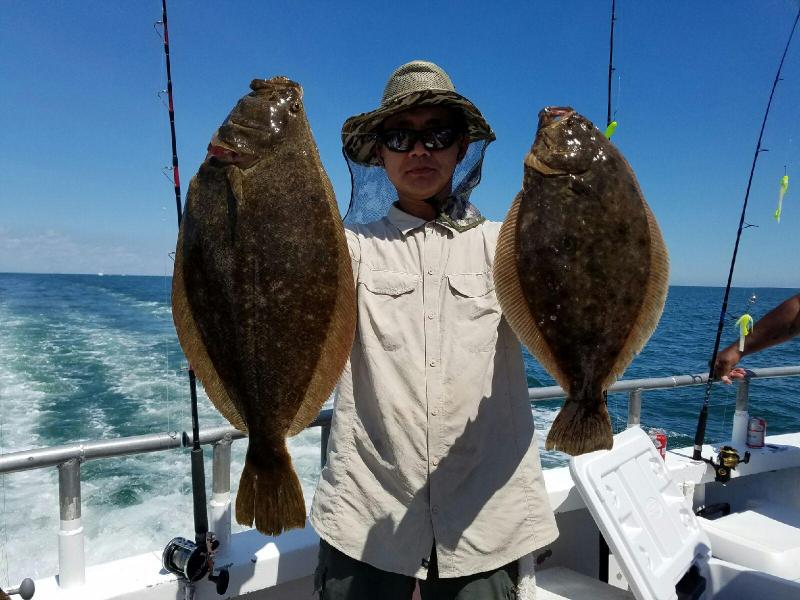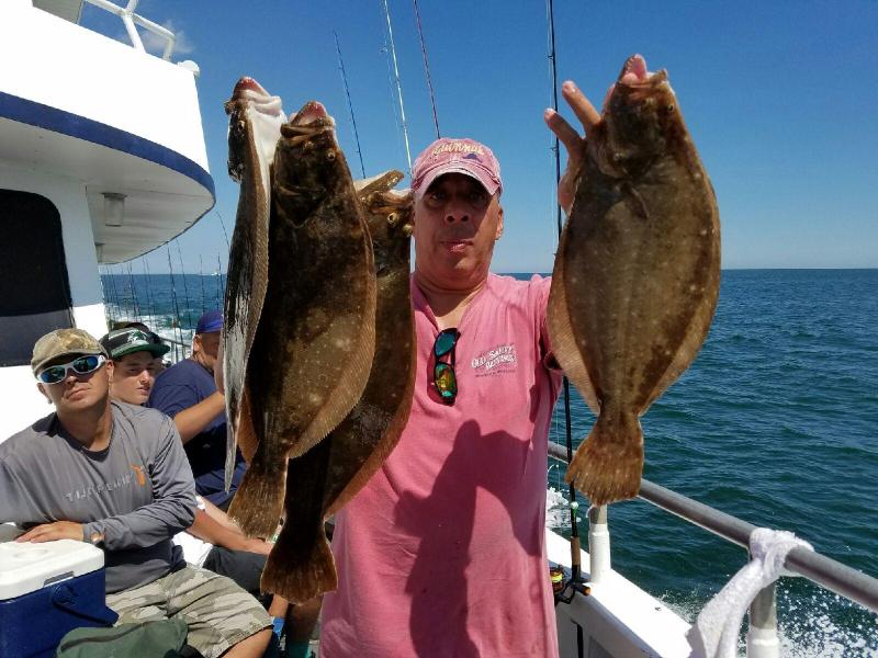 8-7-16 Another quality day out there with a great bunch of people....Fishing was pretty slow to start for us..did not find much life ealry on...Ripping north current and breeze seemed to slow the bite down for us inshore..We had to hunt around a bit to find some fish which we did..we found it out deeper and while not great fishing,,,some of the guys had some nice keeper flukes and some really nice sea bass to go home with..High hook had 4 keeper fluke and some had both fluke and sea bass..Hard to get everyone fish,,not everyone did but I was happy for that were on the top of there game or just lucky what ever you want to call it...Fast Eddie took home a large daily pool worth 1,015 bucks!!!!!Nice job Eddie...I think he had a couple of nice keepers and a few nice sea bass....Check out some pics....the seasonal pool is now worth close to 3400 bucks and growing everyday....Come on down..cant catch em on land!!!See ya tomorrow for coffee!!