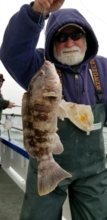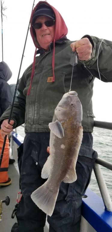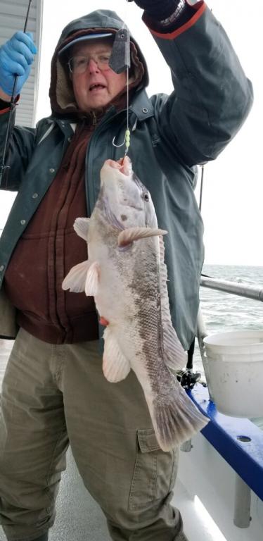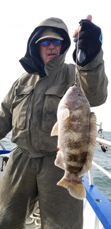 Blackfish Report Friday January 4th. Hey gang we made 3 drops from 70' to 115 had some nice blackfish on the boat today. Steve's high hook with 3 nice ones Jake had 2 big ones Jimmy Custer with several and other guys have 2. All in all not a bad day for this time of the year. Weather does not look good for Sat and Sun. Our next trip will be Tues., Jan. 8th.