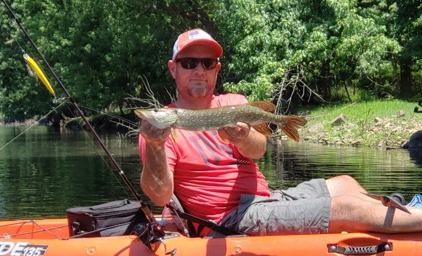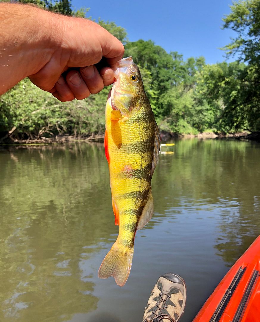 Hooked up with Mikey and SkunkCity for a float trip today! Water was a little high from Fridays rain but we put together a catch of Perch, Pike, a lone LM and a slimy Pickerel. Today was a slow pick and basking in the hot sun didn’t make it any better. It was hot as balls. My legs are fried, haha! No signs of big fish this go round but you never know what the next trip will bring. Good times were had by all that’s for sure. Well, maybe not so good for Mikey. He doesn’t seem to like the Kayak thing much at all. Bummer! TIGHT LINES FELLAS!