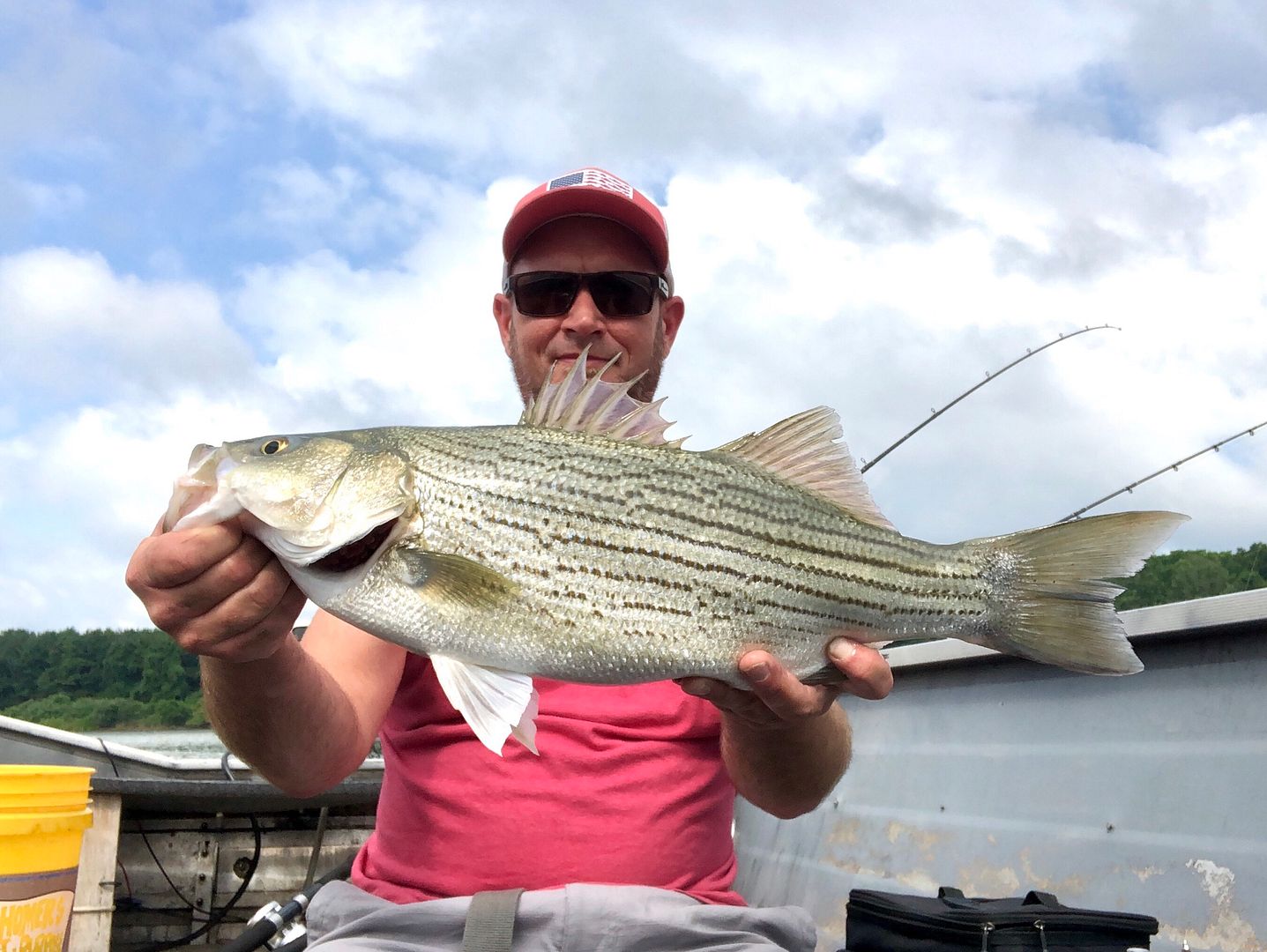 Started the 4th off with a triple header of Wipers, all 24 inches or better. Talk about mayhem. All the lines were crossed and I still managed to get the 3 of em’ in the net. YEA BUDDY! Next pass was a double of 21 inch fish and then slow pick of White Perch and smaller Hybrids to end the day. Beautiful morning on the green Wiper waters!