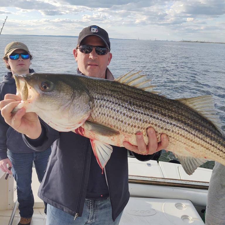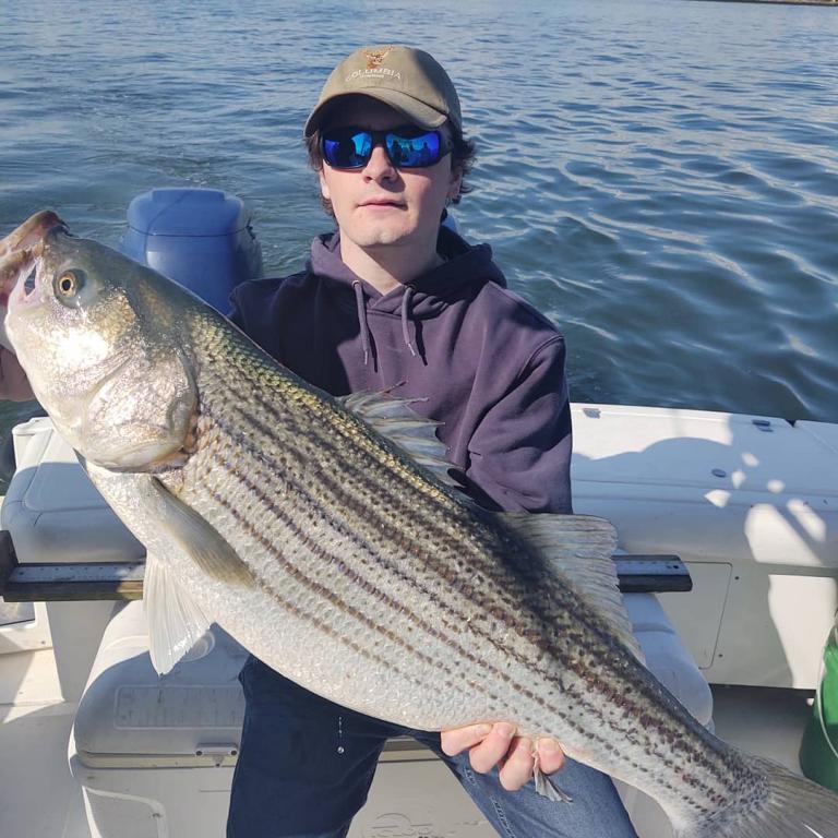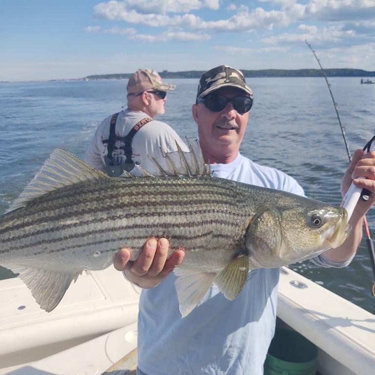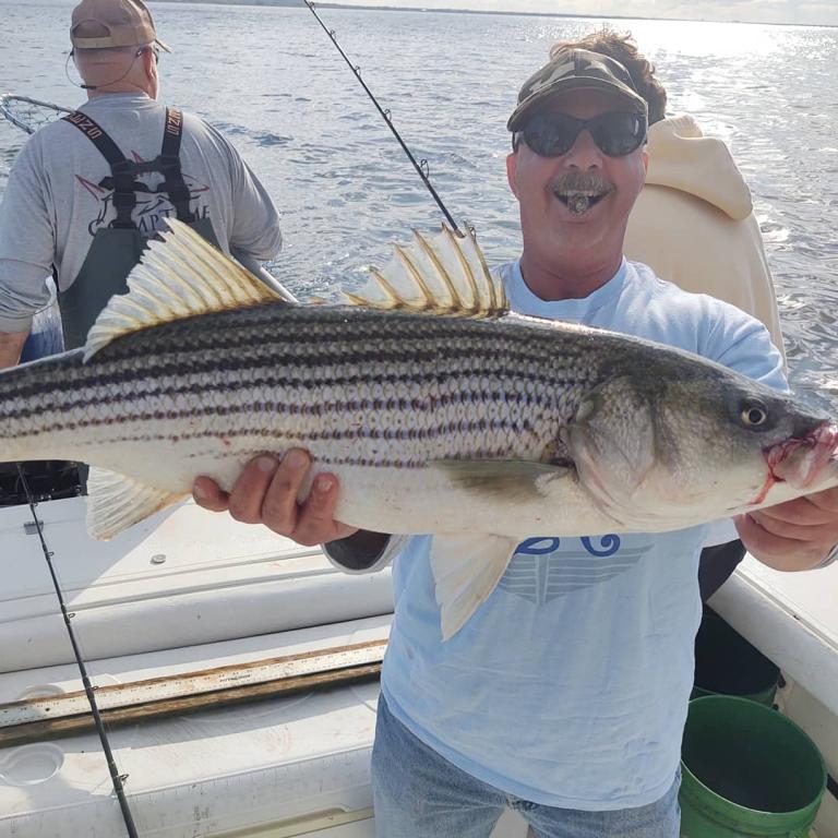 Afternoon Striper trip with Chip!!! Found them pretty quick and had big fish all afternoon. Had perfect weather and with the fish cooperating it couldn't have been better!