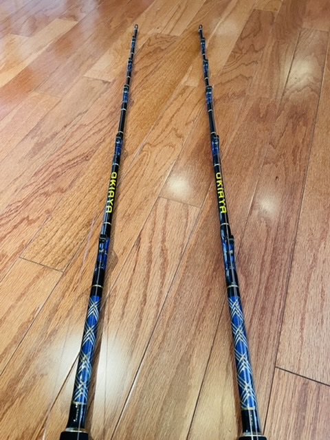 Reels are loaded with 100# braid and 80# mono. Rods are brand new Okiaya roller guide 5’6” stand ups. $400 for the pair.