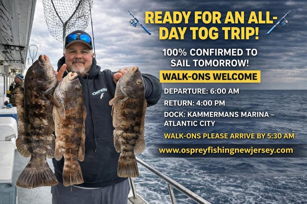 We are 100% CONFIRMED TO SAIL TOMORROW 🚢 Walk-on customers are welcome! 🕕 Departure: 6:00 AM 🕓 Return: 4:00 PM ALL CRABS *WHITE AND GREEN* TACKLE INCLUDED IN THE PRICE 📍 Dock: Kammermans Marina – Atlantic City ⏰ Walk-ons: Please arrive by 5:30 AM Full day targeting tautog, see you there! 👉 www.ospreyfishing.com