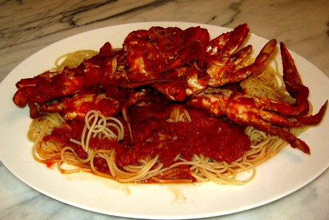 One is roasted chicken and the other is crabs marinara over linguini. Here is the recipe for the crabs. We had it the other day and as usual, it was great. We must have sat there for 2 hours picking those crabs. Boy they were good. Thanks Judith Dear! 1/2 cup extra virgin olive oil 4 cloves garlic, chopped . 3 28 oz. cans crushed Jersey Fresh tomatoes 1/2 cup white wine 1/4 tsp. oregano and parsely each 1/4 cup fresh basil chopped 1/4 teaspoon Salt and Pepper 2 dozen lg. blue claw's crabs, cleaned by removing shell, wash under water removing all insides 1 1/2lb. Barilla linguine In an 8 quart saucepan add olive oil and garlic. Brown lightly on medium heat. Add remaining ingredients except crabs. Heat on medium-high temperature until boiling, reduce heat to low. Simmer 30 minutes, stirring frequently. Add the crabs. Return to boil and cook for 30 minutes. Remove and serve. over cooked linguine with crispy bread .Makes 6 servings. Enjoy Leif