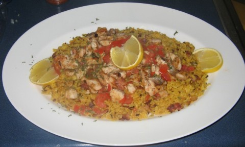 Mackerel over Saffron rice/bacon/onion and tomato