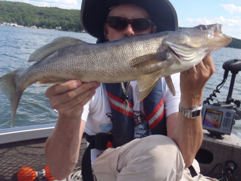 Two muskies on today...one dropped at the boat....nailed this beautiful tiger the most beautiful fish that swims, a walleye 5-6 lbs. and a big perch.....all trolling deep breaklines with spoonplugs....