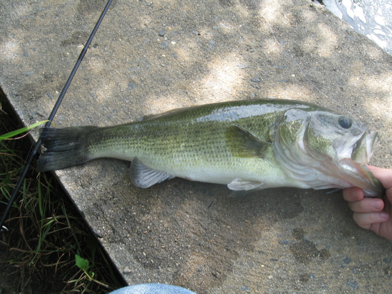 By the time I made it back to my neck of the woods, the rain had stopped, so I decided to try one more spot. I headed down to the ponds in Farmingdale by the Manasquan. My first cast with a slug-go yielded a dink largemouth. After several more casts I decided to check out what was going on in the lower pond. Good thing I did, because right at the inflow pipe I saw a big green football with eyes just chillin' in the current. I flipped the slug-go right next to him, gave it a twitch, and he sucked it right in. After a surprisingly brief fight I landed my biggest bass of the season so far.
