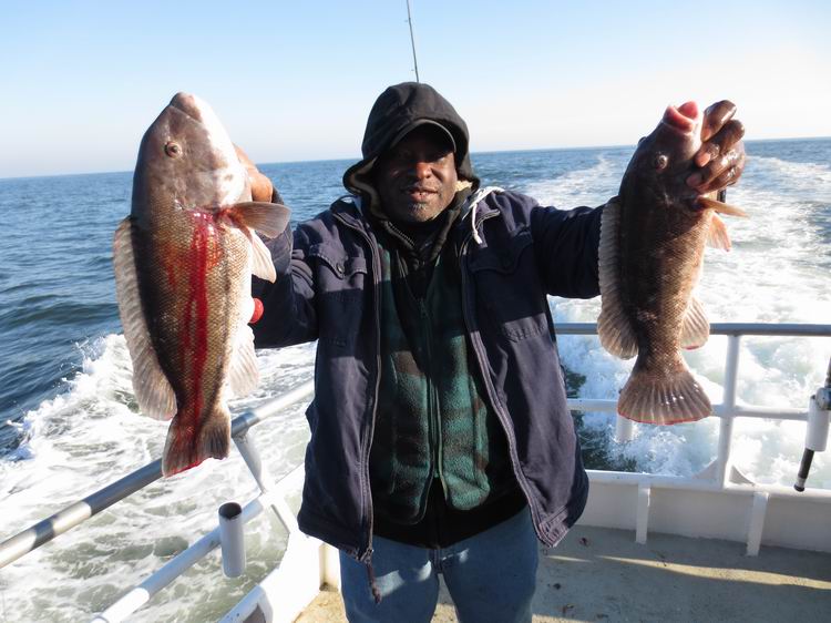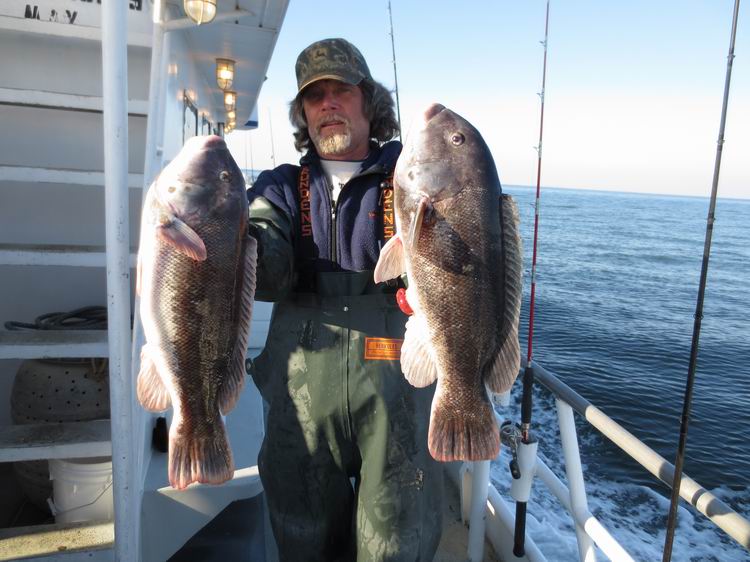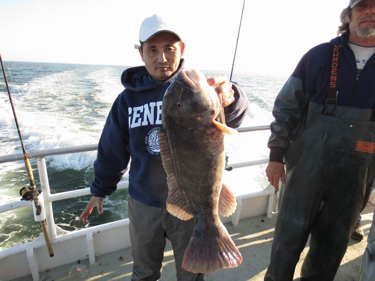 We have been trying to pick our days and today was the one you should have choose. Great weather and fishing. Once again it was all tog except for one small cod. Plenty of limits with Mike Baunaquista from Middletown with 10 keepers out of over 30 tog. Our pool fish today was 8 1/2 pounds caught by Park S Jay from Palisades Park. His first trip with us. Greens and white leggers both worked well. More shorts today than yesterday but great action for most. Of course when blackfishing a few guys struggled.