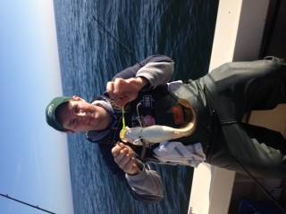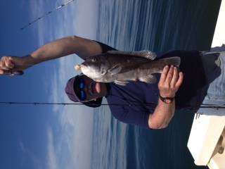 Friday morning we left the dock at 6:00 am with a group of hardcore bottom fishermen. When i say hardcore, i mean it. Unless these guys can bounce their sinkers on a rock or a wreck, they ain't goin'. I promised them we would check the bass first thing in the morning and then go bottom fishin'.They were well aware that sea bass, blackfish, and fluke were closed and they may wind up goin' home with empty coolers. That was no problem, they just wanted to bend the rod. OK, let's do it! A couple of minutes after breaking the inlet we came across a pile of bunkers, tossed jigs for a while and moved on. This scenario was repeated several times as i ran up the beach. Plenty of bait but no bass. These gents are sharp. After getting several miles up the beach, they knew we were getting into prime bottom fishing area. It didn't take long for one of them to ask when we were going to drop the hook. I knew that was going to happen, told them to cut the jigs and rig up. First drop was really good, started out with some really nice ling followed by a really nice pick of seabass and togs. Gave each one of the seabass and togs a nice kiss and released them. Tell you what, with those big lips on the togs, they make great kissers. Guys wound up with plenty of tasty ling fillets for dinner.A fun day on the water and i was pleasantly surprised at the numbers and size of the seabass. Looks like another cancel for tomorrow with four to six footers predicted. Been a tough spring but appreciate the days like today. Turned out to be a three ling circus. Take care, captain tom joseph