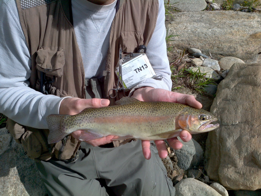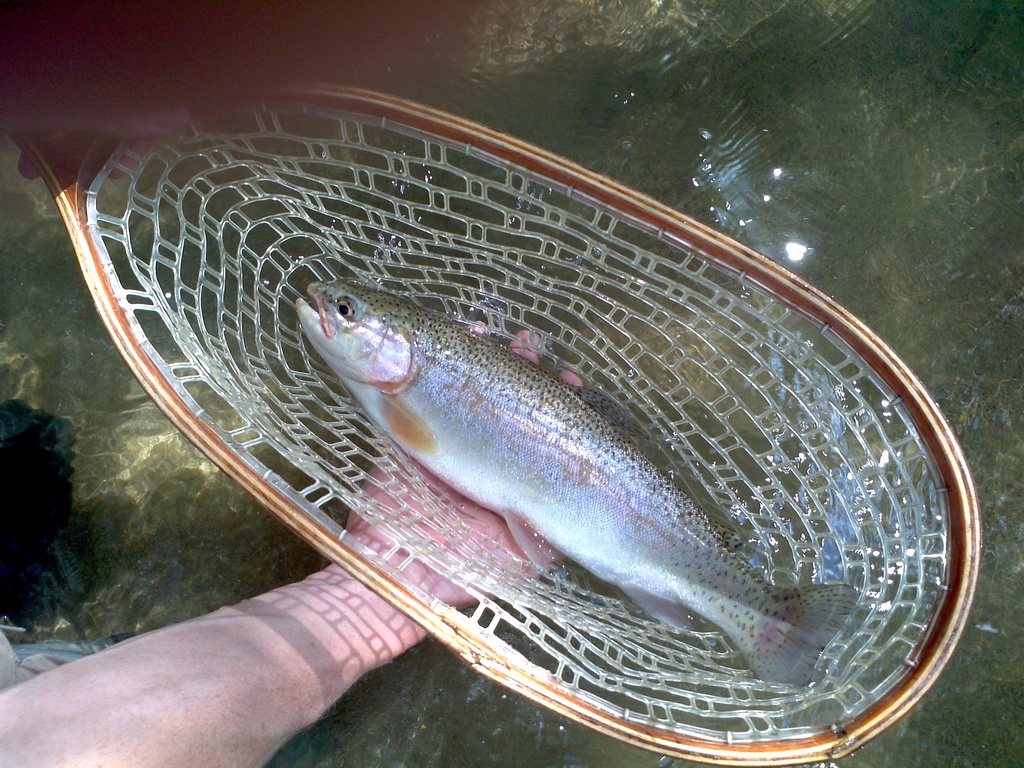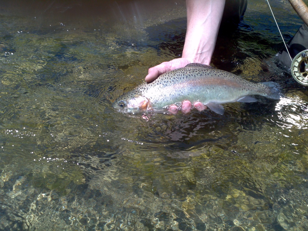 first day with the guide was good, learned some great new tricks to work bigger waters with buggers and nymphs. the guide brought an orvis helios rod that i was using, sooooo nice... downside that going back to my rod feels like crap now. oh well, have to live with it, no way i will get that purchase past the wife... anyway, had several hookups, but since we were fishing barbless flies on 6x tippets in fast water, landing the fish was a challenge. finally was able to get a couple in for pics & release.
