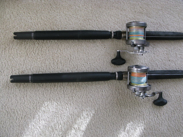 Two custom built rods with Shimano Torium 20 reels, setup with 65lb depth indicator Braid line with mono topshot. These rods also worked perfect jigging cod off Massachusetts. They are graphite composite 7' long rods with TOP OF THE LINE Fuji SIC heavy duty guides, heavy duty reel seats, slick butt bottom grip for easy removal from rod holders and Fuji gimbal. The rods are line rated 30-50 with medium action. Would also work well for deep water tile fish with a larger reel?? $225 each setup which is a steal for rod, reel and braidline!!